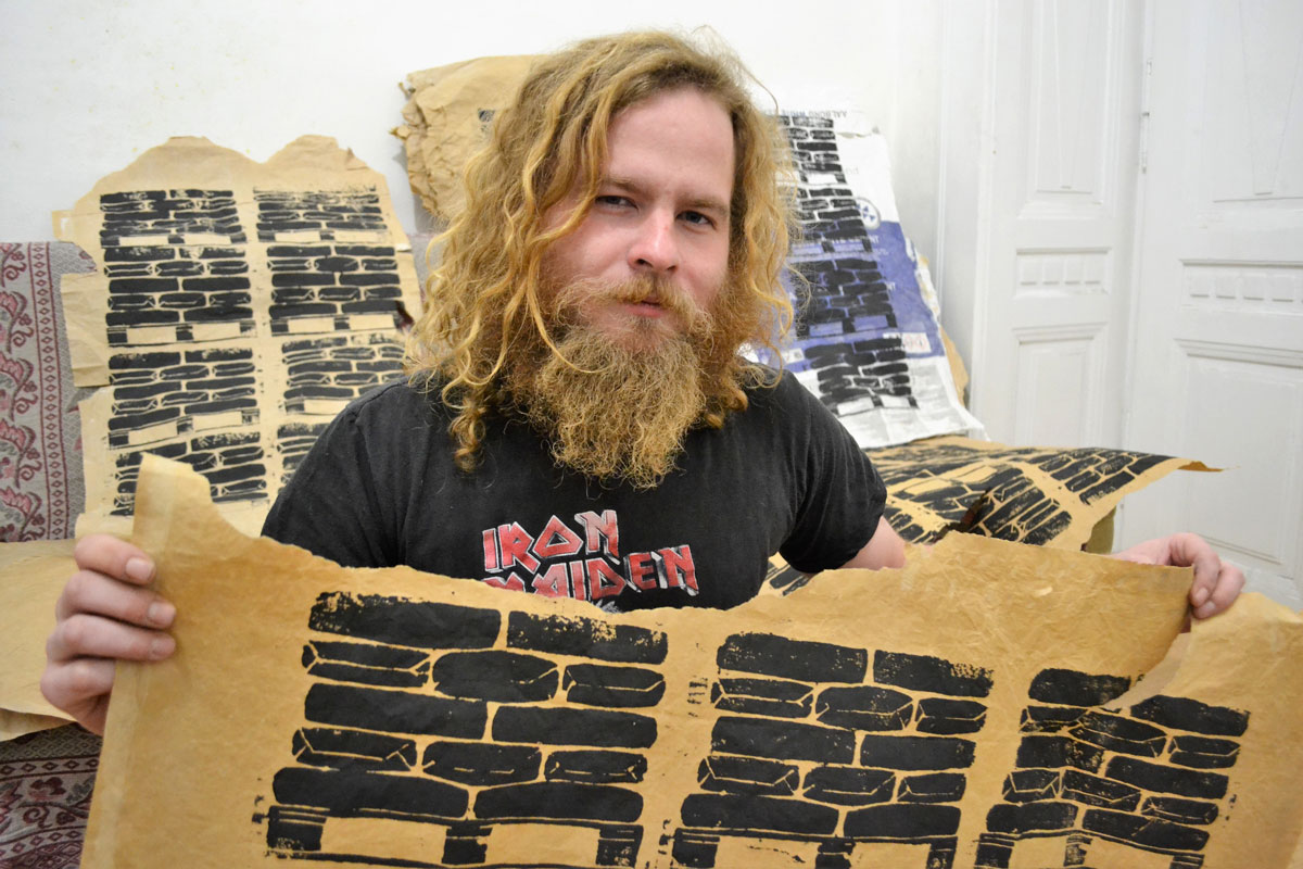 Petr Szyroki s grafikami pro výstavu v Galerii Jáma.