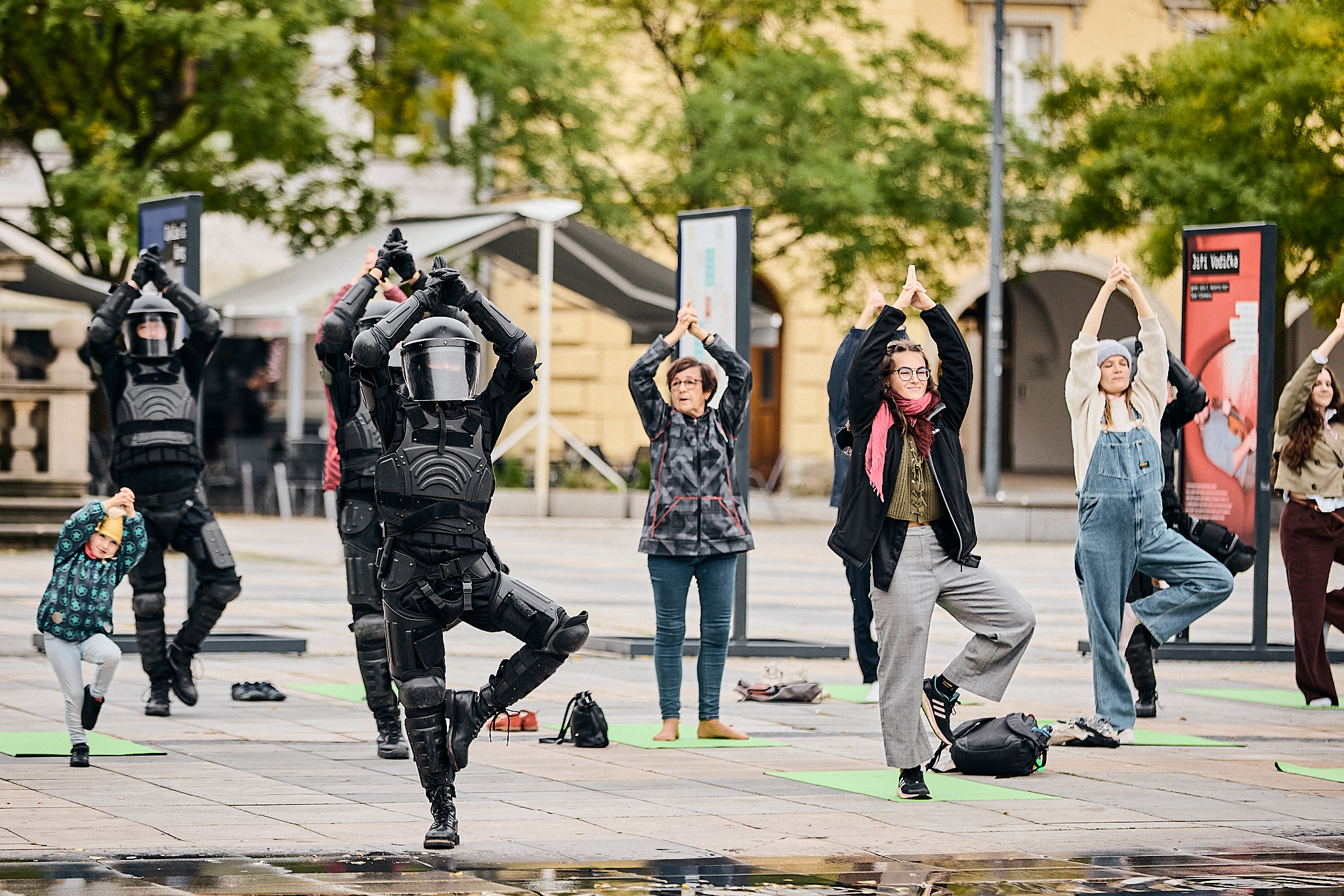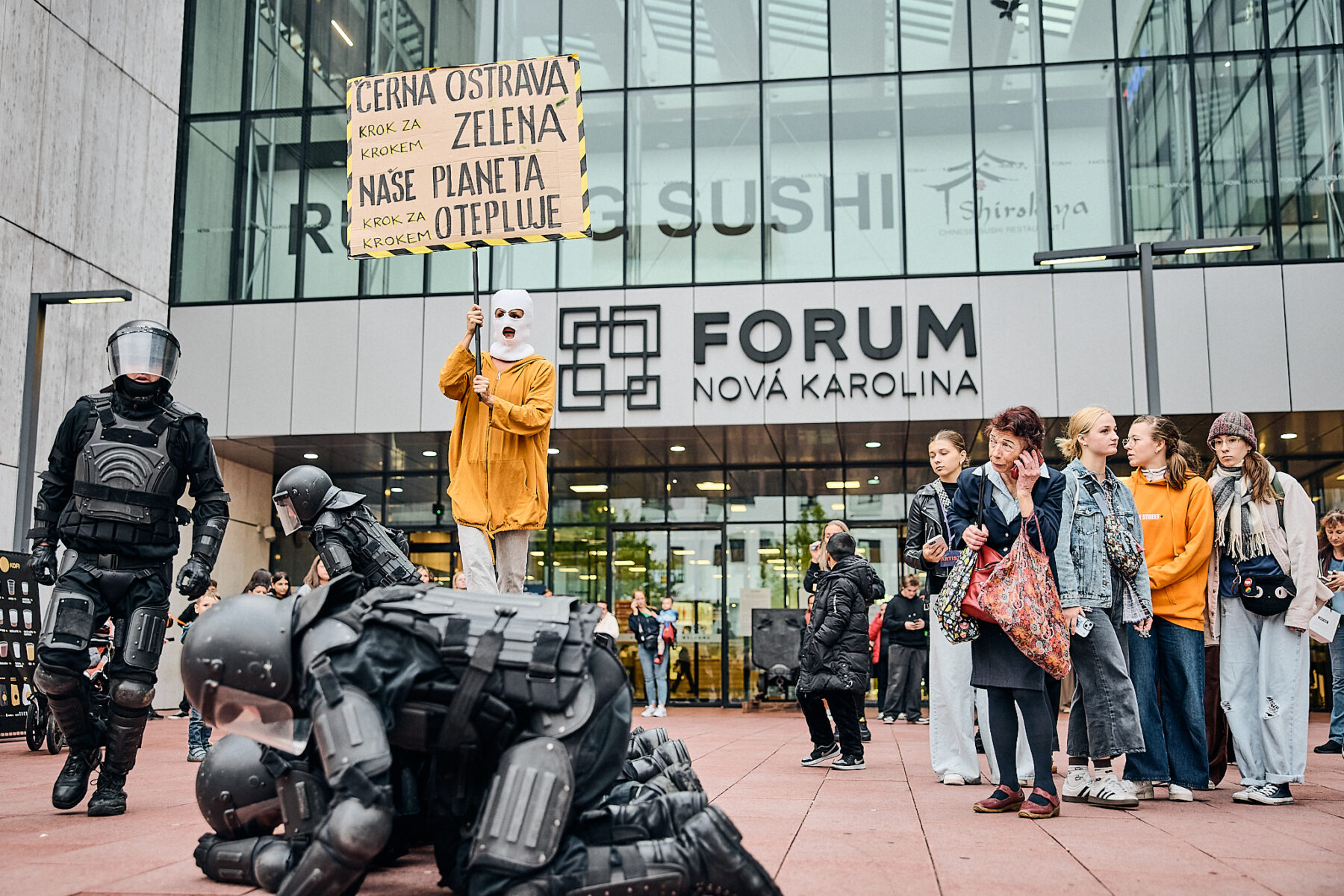 Součástí byla jóga, objímání se, setkání se strážníky městské policie, padání ze schodů, kráčení po zádech i žalostný pláč nad květinami. Site-specific performance rozhodně zarezonovala okolím svou absurditou i jedinečností, přitáhla pozornost a vytvořila mnoho otázek — zejména obyvatelé Ostravy nečekali, že jedno páteční odpoledne uvidí těžkooděnce, jak radostně skáčou kolem fontány nebo leží na trávě a naříkají nad oteplující se planetou.