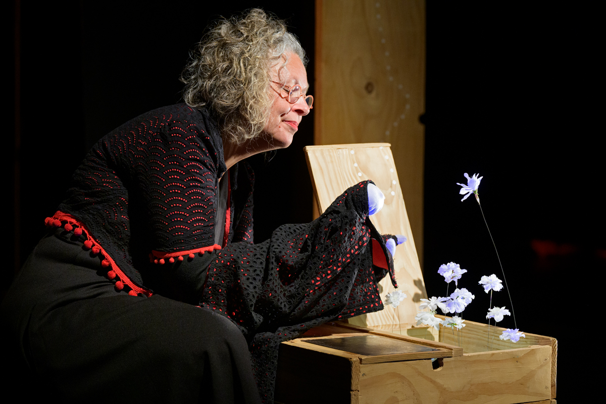 Jediná loutkoherečka, žena neurčitého středního věku, Lucie Catsu, zároveň autorka scénáře, na začátku představení francouzsky přivítala děti i dospělé diváky v hledišti. Nebyla však sama. Poblíž stojící muž, překladatel z francouzštiny Michal Zahálka, větu po větě překládal do češtiny. Po přivítání pomalu haslo světlo v sále alternativní scény Divadla loutek, herečka se posadila na jednu z bedýnek a Michal Zahálka usedl na židli na druhé straně scény.