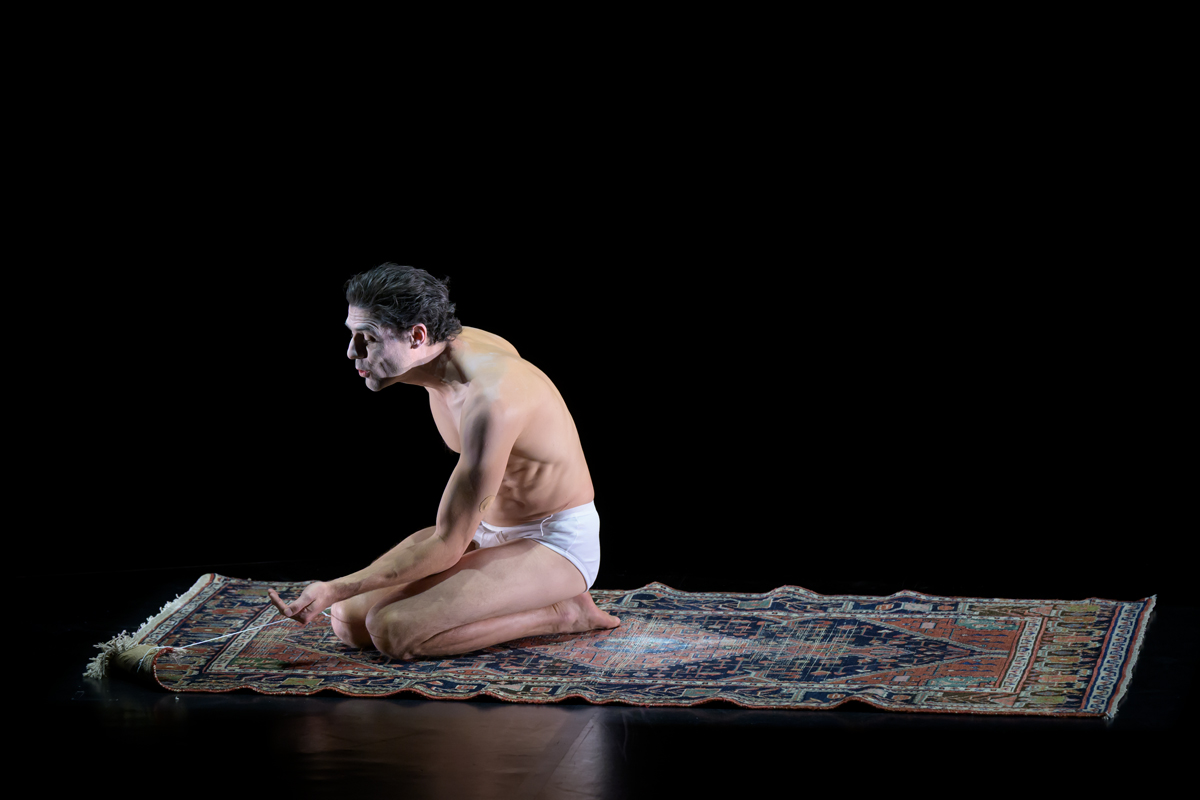 Klaunské sólo o jednom koberci, tak je toto představení předznamenáno ve festivalovém bulletinu. A skutečně, na jevišti je jen jeden muž a jeden koberec. Vše zpočátku probíhá bez jediného slova. Po třetině hracího času dojde na mluvený projev. Do té chvíle publikum sleduje dialog mezi mužem a kobercem, proměnu koberce v ve dvojici psů, pak dalších bytostí, až se sám koberec stane dalším partnerem v dialogu. V té chvíli performer promluví. A mluví o fantazii, o tom, co se odehrává v mysli každého člověka v dialogu sama se sebou.
