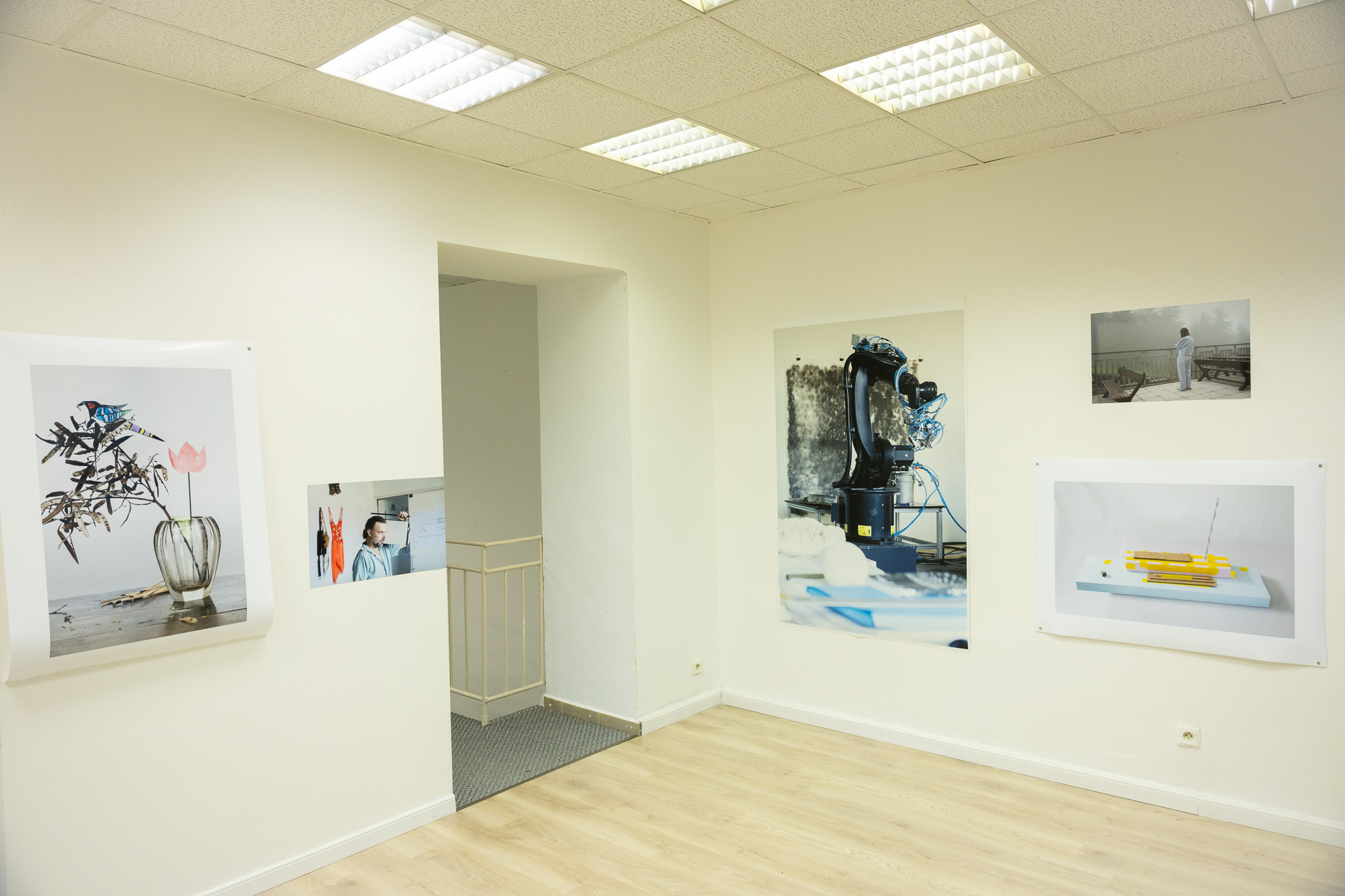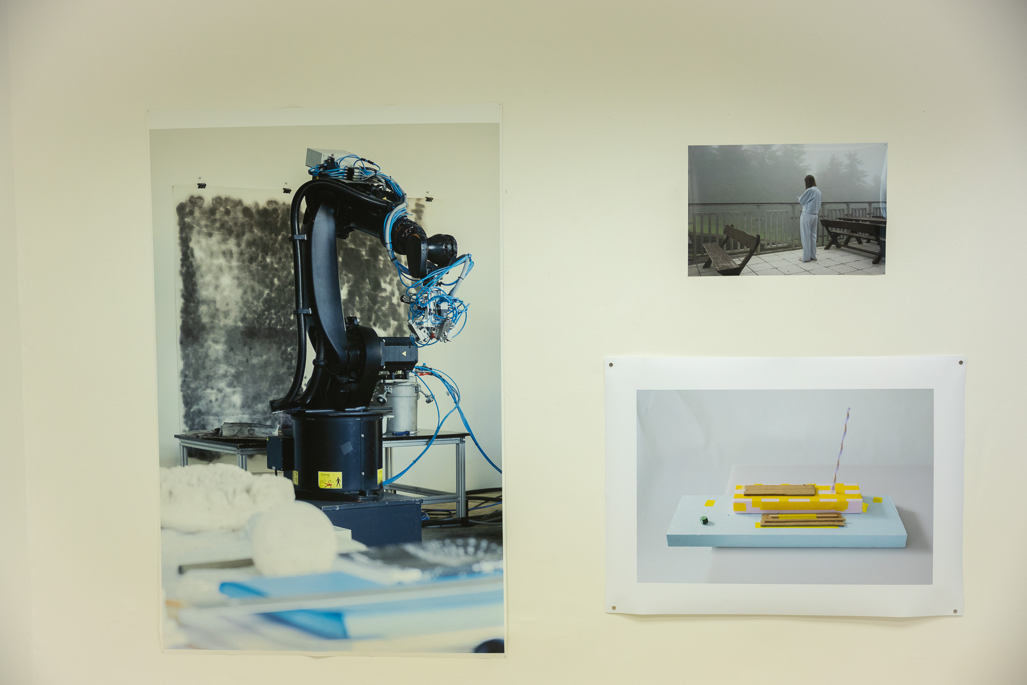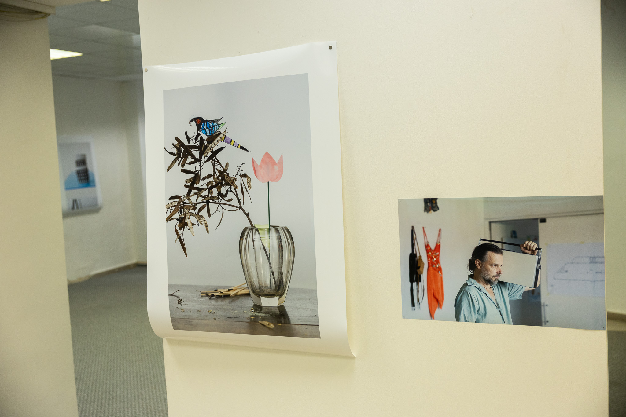 Na stěně, která nás kontaktuje přímo proti vstupu do galerie je pak umístěna dvojice fotografií, která rozproudí interpretační mízu pravděpodobně pouze u insiderů. Na pravé z nich je malíř Jiří Černický, který se před dvěma lety dostal do mediálně exponovaného sporu se svými studenty na pražské UMPRUMce. V tomto sporu Černický na jednu stranu figuroval jako obhájce „normálnosti“, na straně druhé jako boomer narážející na křehkost současné mladé generace. Fotografie Tomáše Součka jakoby tuto situaci poeticky glosovala. Možná je toto dekódování příkré, ale mně u této fotografické dvojice naskakuje. Váza s křehkým větvovím, papírovým ptáčkem a květem ve skleněné váze a na vedlejší fotce Jiří Černický v tak trochu macho pozici s rádiem na rameni a erotickými proprietami na stěně v pozadí. Otočen zády odchází…
