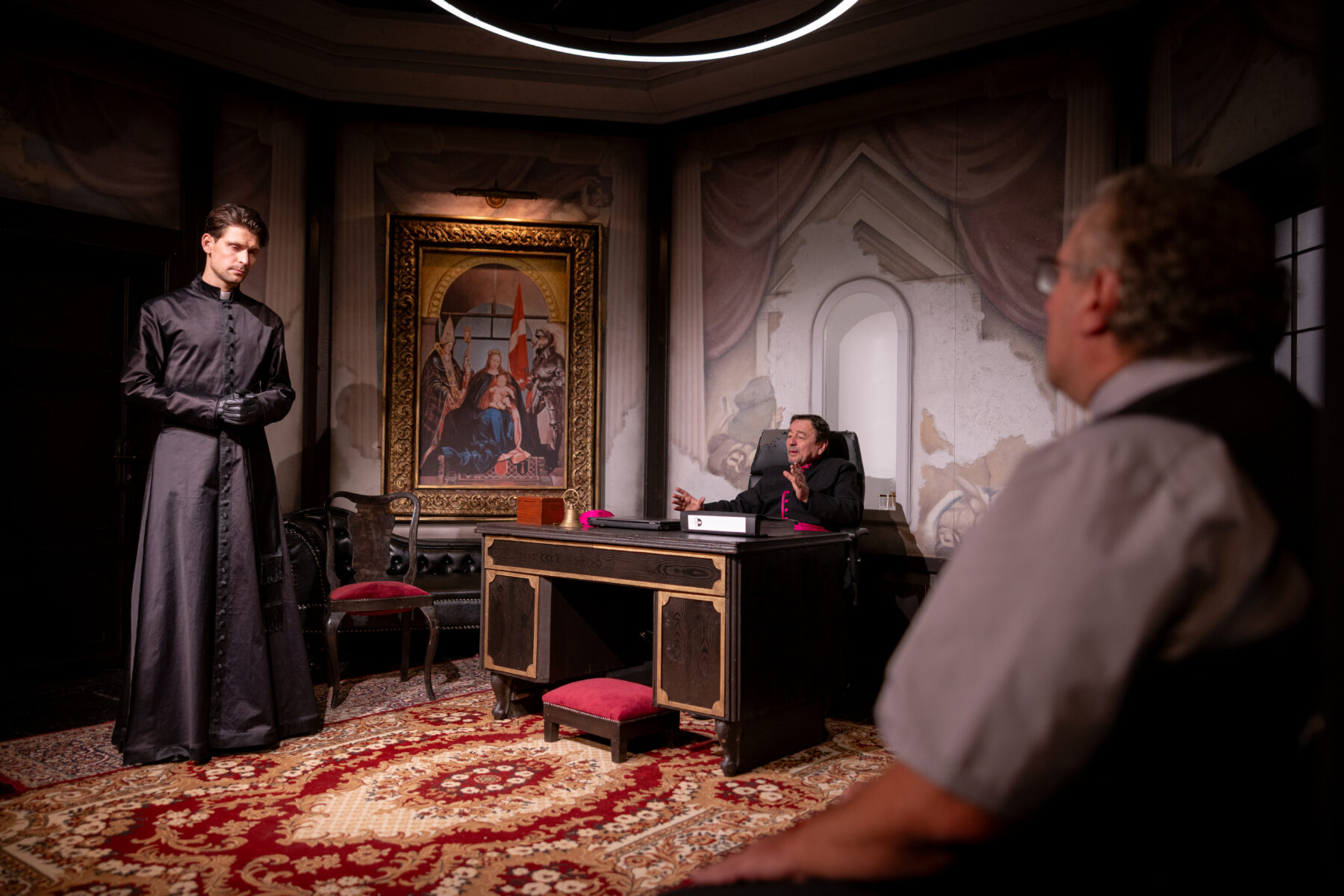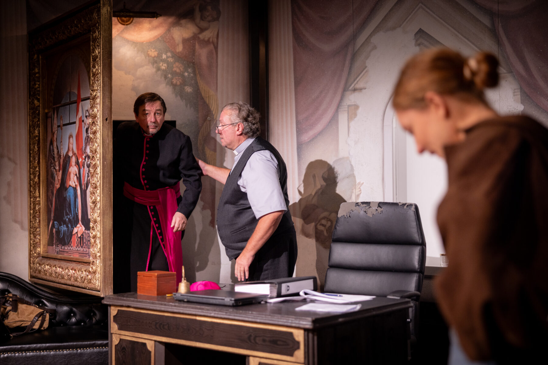 Komorní prostor Dvanáctky vytvořil dojem, že se diváci nacházejí přímo v biskupově kanceláři. Scénograf Ján Tereba na velmi malé jeviště přenesl biskupovo zázemí sestávající z velkého kancelářského stolu s výraznou kancelářskou židlí. V prostoru se nachází rovněž masivní černá pohovka. Na stěně je umístěn barokní obraz Madonny s Ježíšem ve zlatém rámu, který skrývá dveře do biskupského archivu. Za kancelářských stolem ve výklenku zdobí interiér socha panny Marie. A nad celým prostorem svítí výrazný neon v podobě svatozáře. Biskupská kancelář tak působí okázale.