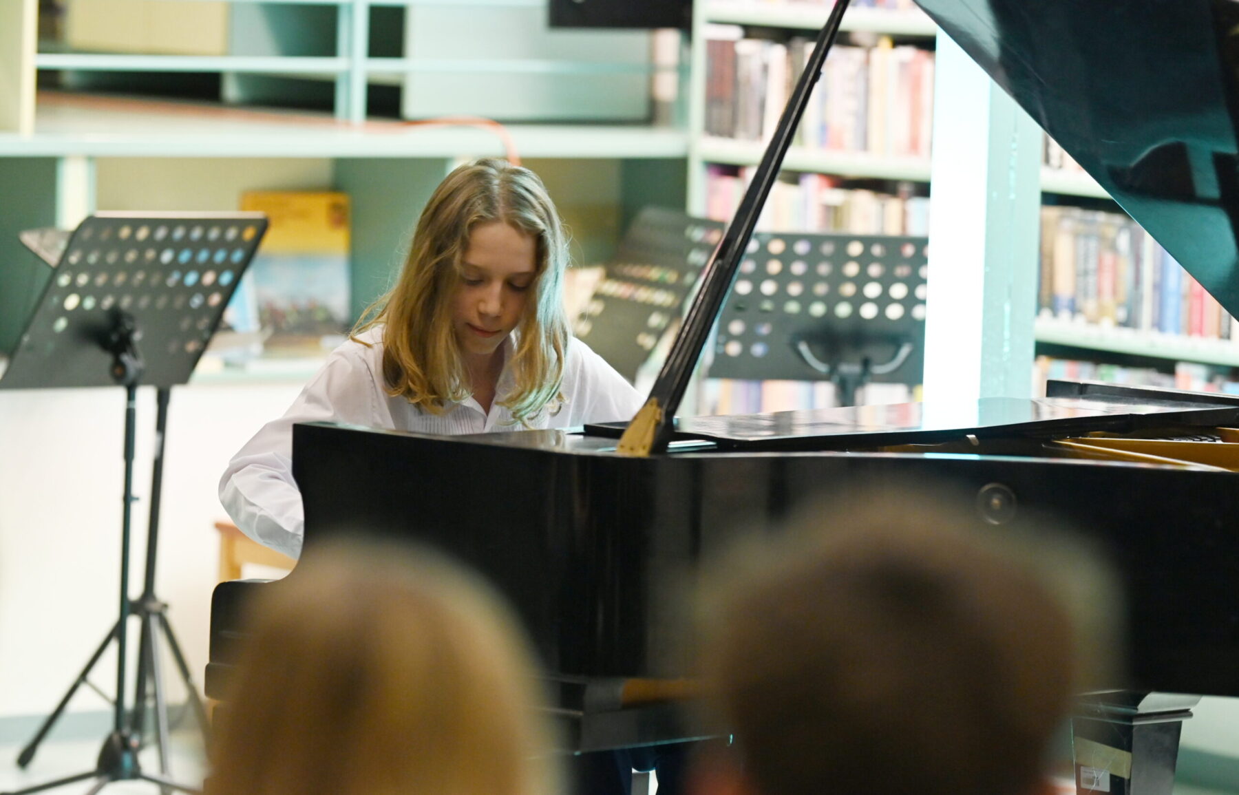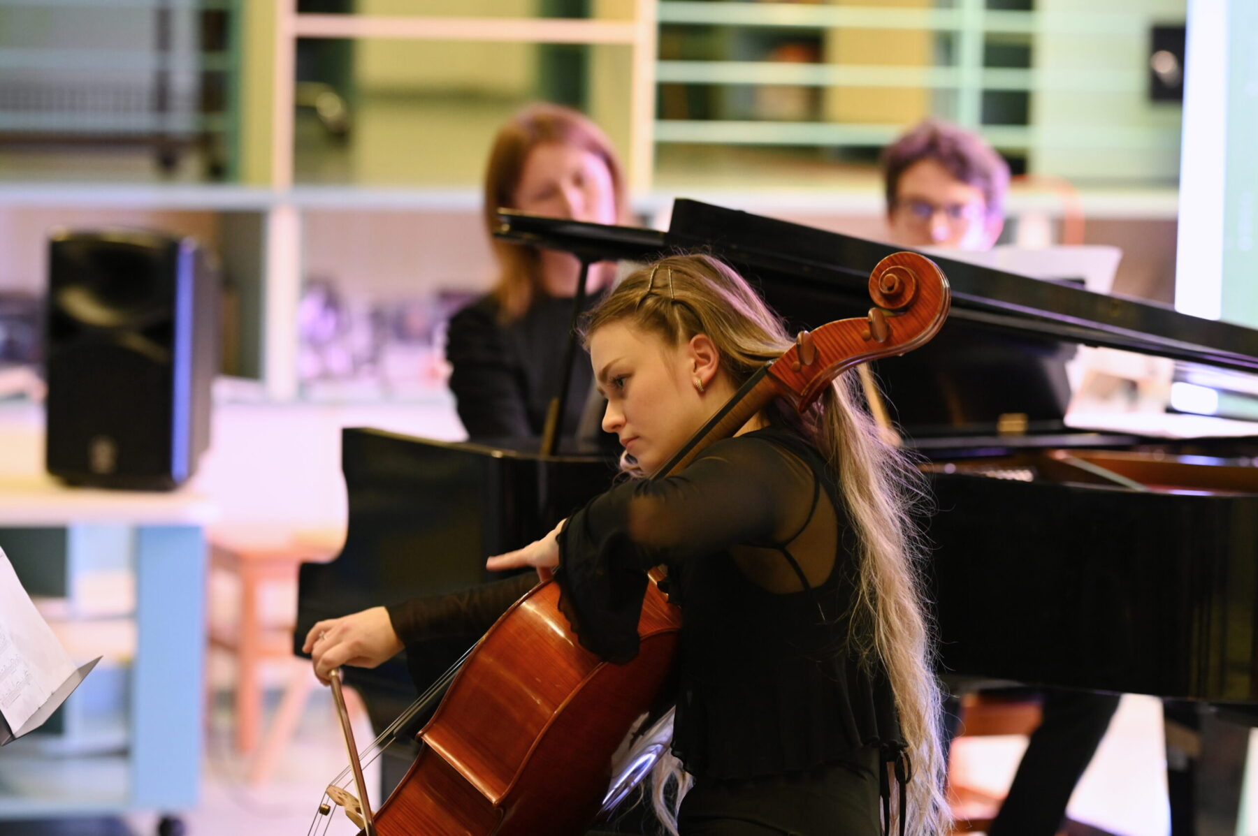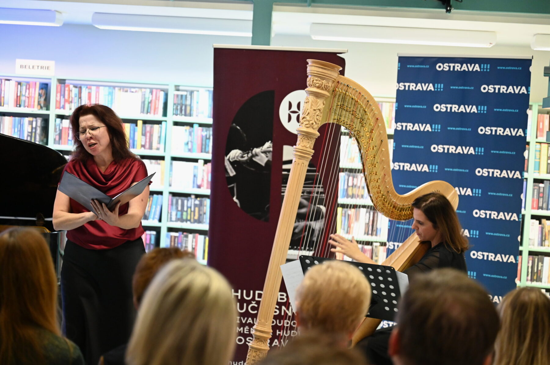 Naprosto jiný typ neklidu — existenciální, společenský — přinesl Jan Grossmann se svým cyklem písní pro alt a harfu O hrůzách. Texty Evy Kotarbové otevřely dveře tématům, která v prostoru knihovny působila až hmatatelně: ekologický žal, rodičovská odpovědnost, tíha společenských rozhodnutí, atmosféra Ostravy kolem roku 1988 – to vše je v textech přítomno jako vrstevnatý otisk doby i existenciální výpověď. Hudba tu nebyla abstrakcí, ale přímým komentářem, artikulací bolesti i naléhavosti. Kombinace altového hlasu a harfy byla v kontextu témat zvláštní, ale smysluplná — harfa Kateřiny Bendové nepůsobila étericky, nýbrž jako svědomí, zatímco alt Barbory Baranové nesl tíhu slov. Závěrečné harfové sólo dovedlo posluchače až k tiché naději – „k pohádkám“. Ukolébání však nebylo útěkem, nýbrž křehkým přáním. Mezi knihami, jejichž hřbety odkazují na skutečné osudy světa, působila tato skladba takřka dokumentárně.