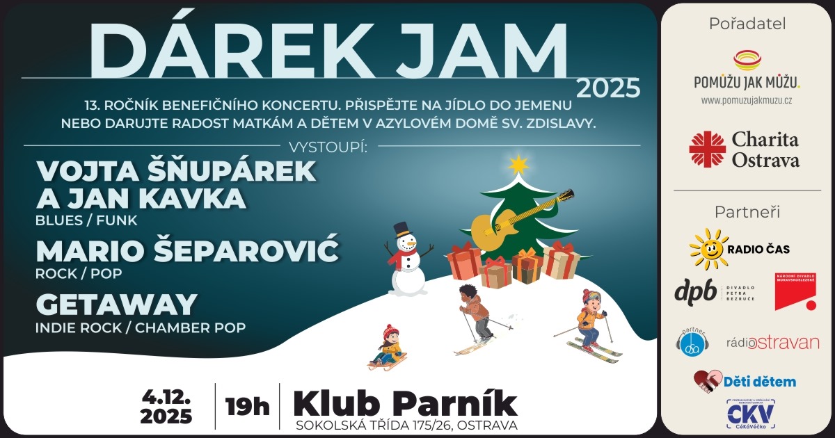 Ostravu čeká třináctý Dárek Jam, tradiční koncert na pomoc lidem v nouzi. Hostit jej bude klub Parník. Ve čtvrtek 4. prosince 2025 od 19 hodin zde zahrají Getaway, Vojtěch Šňupárek, Jan Kavka a Mario Šeparović. Smyslem benefice je udělat radost dárkem maminkám a dětem v azylovém domě sv. Zdislavy a pomoci hladovějícím lidem v dalekém Jemenu prostřednictvím ostravského spolku Pomůžu jak můžu. Pořadatelé akce v čele s ředitelem Charity Ostrava Martinem Pražákem budou také v úterý od 19 hodin hosty živého vysílání Rádia Ostravan.