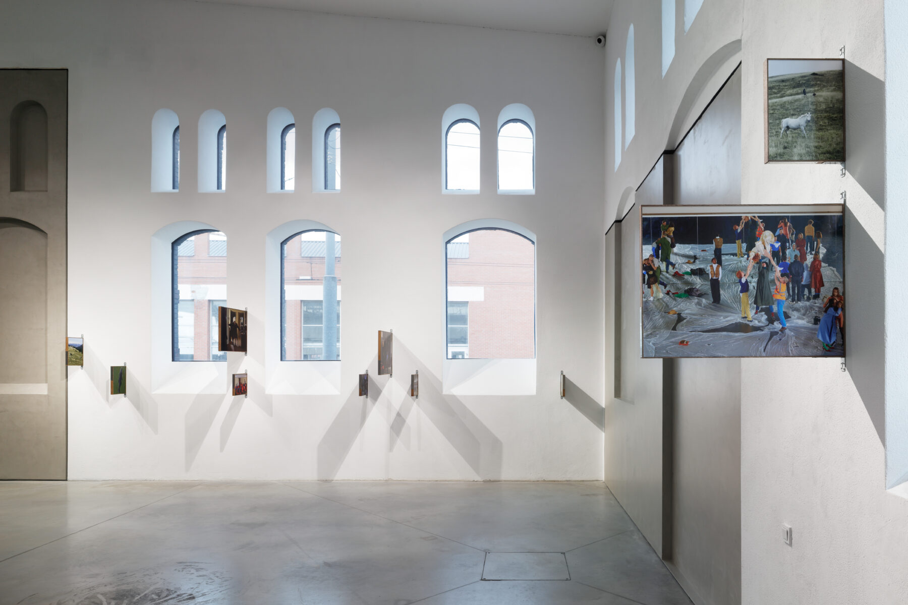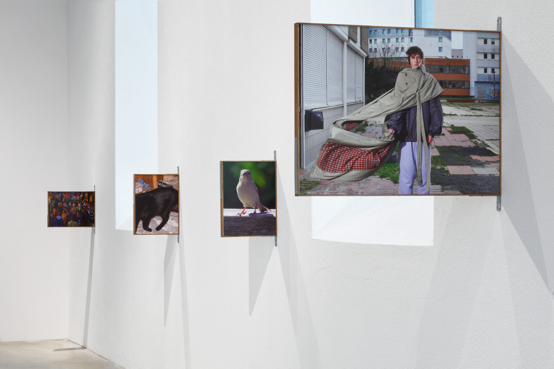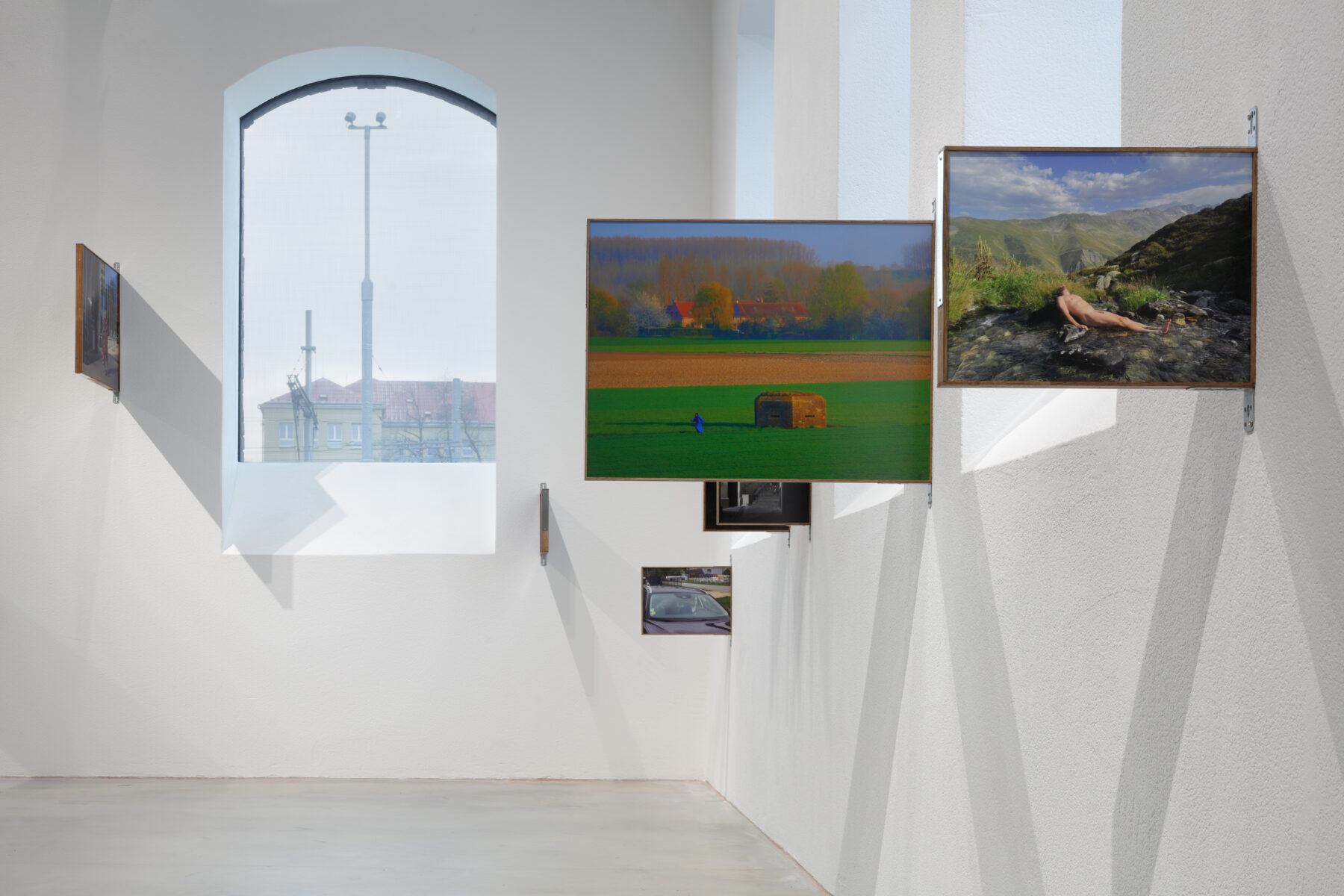 Umělec využil dva výstavní sály, které jsou navzájem oddělené stěnou a prosklenými dveřmi, k vlastní autorské instalaci. Je jednoduchá a sofistikovaná zároveň. Gró výstavy tvoří aranžované fotografie, adjustované z obou stran na silné desky, zabořené svou boční stranou kolmo do obvodové zdi výstavního sálu. Divák tudíž na ně nehledí čelně, ale je nucen obcházet je a pozorovat z bezprostřední blízkosti, stoje při tom bokem ke stěně. Když se otočí o 180 stupňů, má před sebou další fotografii umístěnou kolmo ke zdi, kterou když obejde, najde na reverzní straně desky její pokračování … a tak dále. Možná jen zmíněné dveře mezi oběma sály jsou překážkou pro hladké a ničím nepřerušované plynutí fotopříběhu.