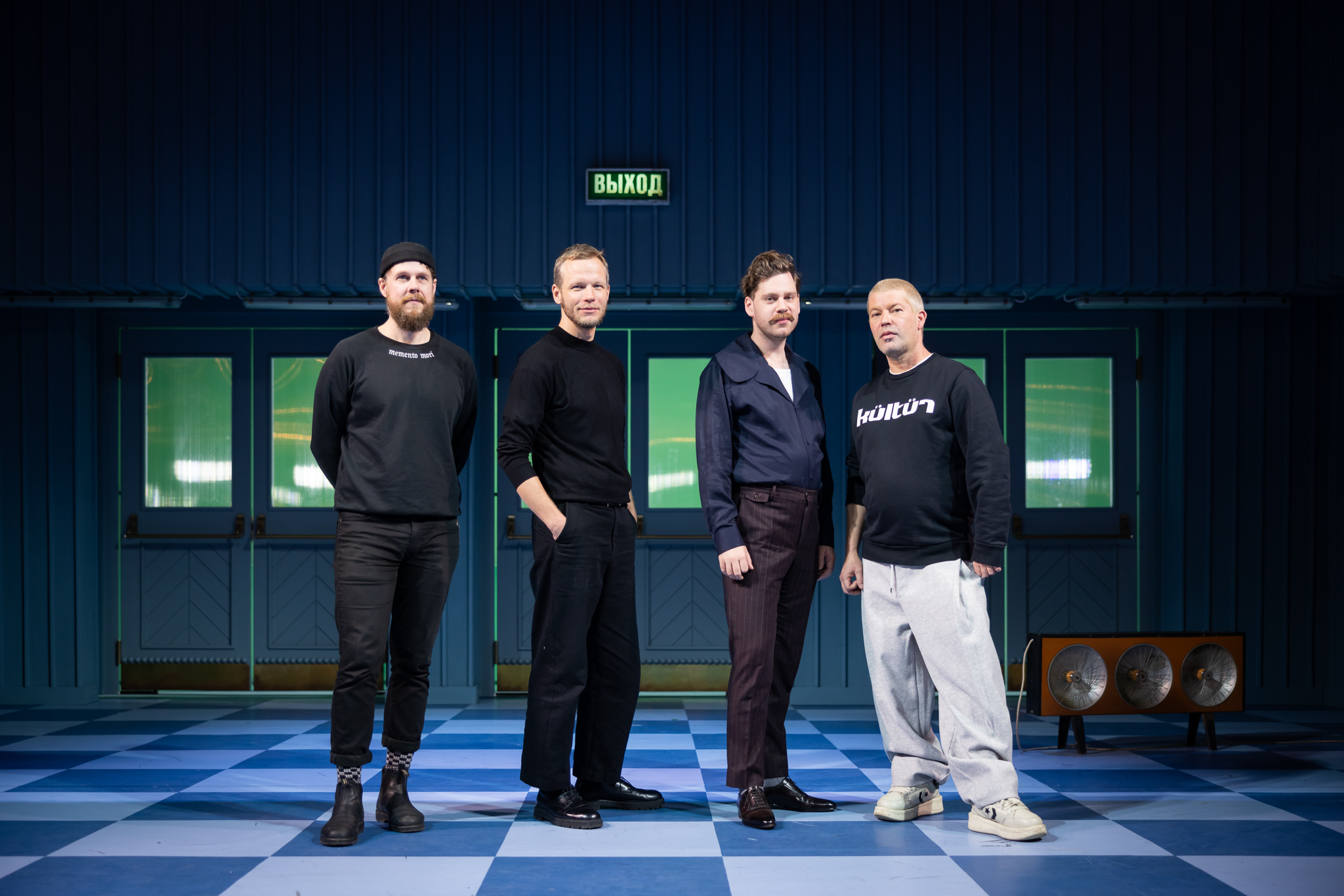 Inscenační tým. Zleva light designer Karel Šimek, režisér Jakub Šmíd, scénograf Petr Vítek a kostýmní výtvarník Martin Chocholoušek. (Foto: Martin Kusyn)