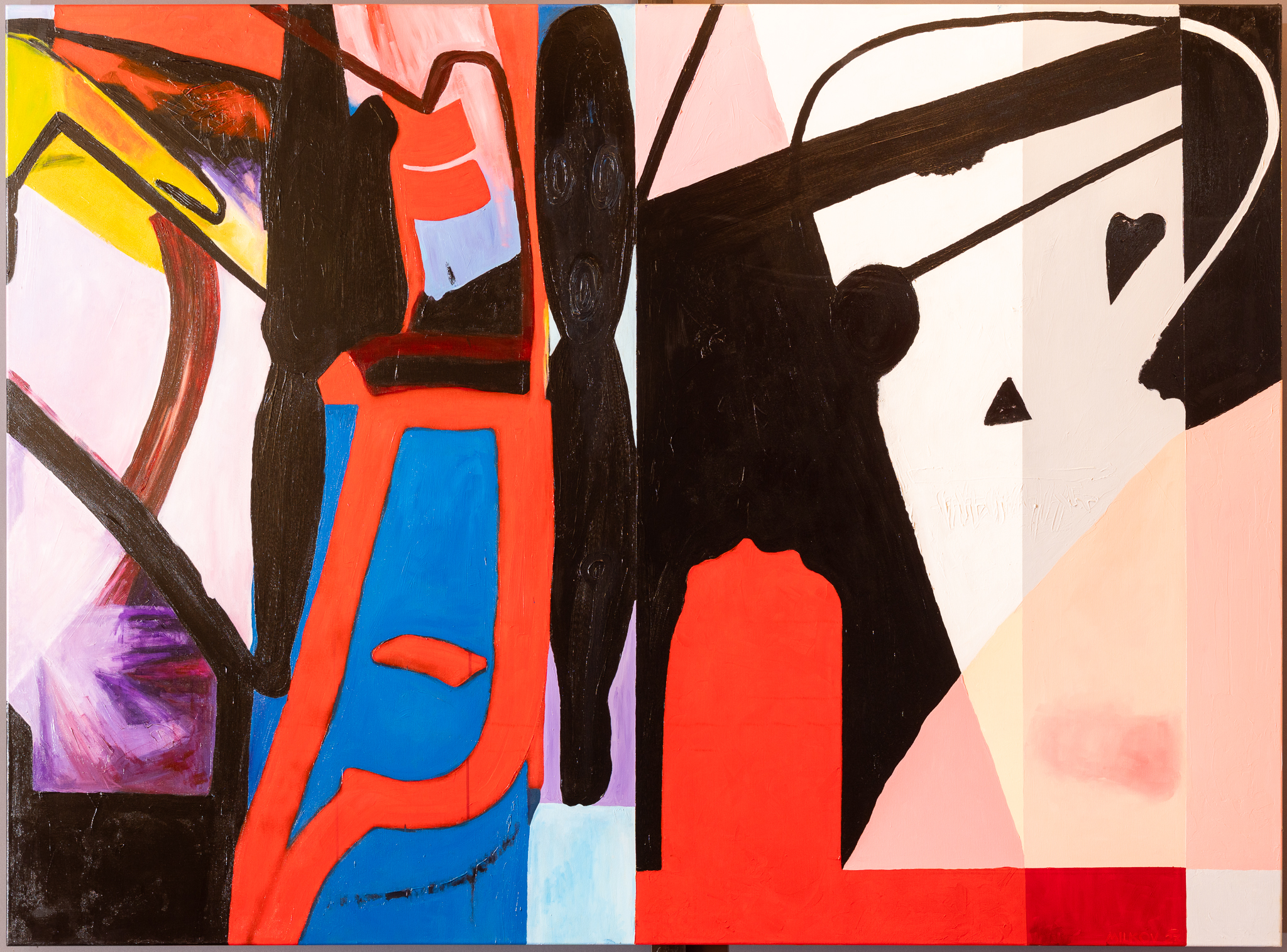 Obrazů, které jsou vystaveny v Galerii současné malby ve foyer divadla, je celkem sedm. Každý má rozměr 200 až 230 cm krát 145 až 155 cm. Jde o malby akrylem na plátně z let 2019, 2023 a 2024. Jsou výrazně barevné, pastózní, monstrózní – ale v tom nejlepším slova smyslu. Dohromady tvoří homogenní celek a kupodivu ani malý prostor mezi obrazy (a tedy i menší odstup diváka) jim neškodí. Vyzařuje z nich obrovská energie, chtělo by se říct, že kosmická. Nakonec nebudeme daleko od pověstného jádra pudla. Názvy dalších tří obrazů zní Kokpit I, Kokpit II a Darth Vader. Aniž bych to na začátku této recenze tušila, měla jsem nutkání přirovnat některé Milkovovy plastiky k hrdinům ze Star Wars. Tak tedy alespoň obrazy můj dojem ospravedlnily. Uff…