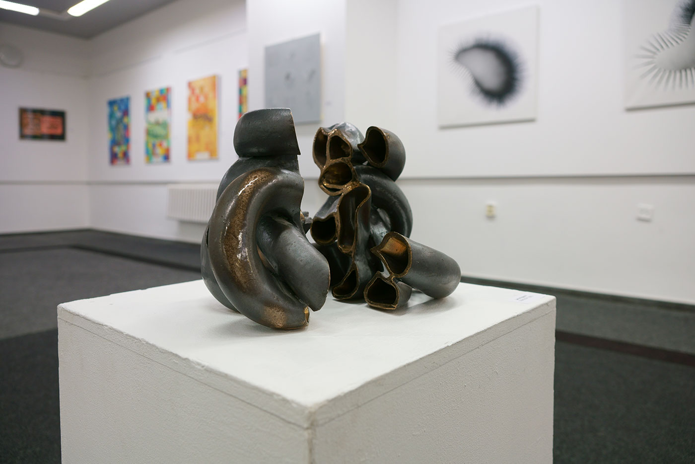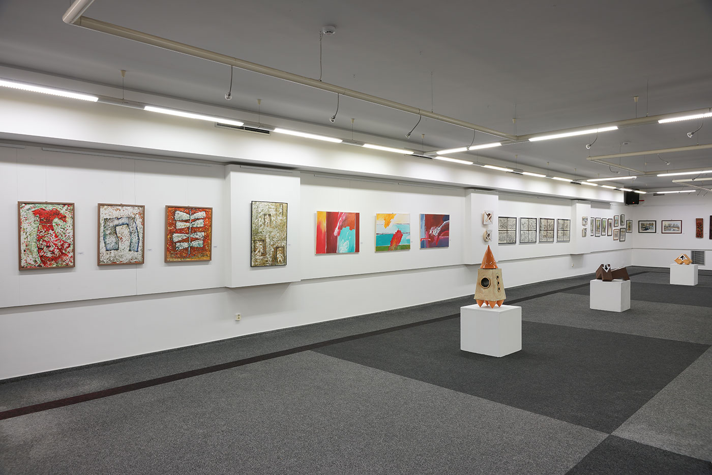 Zleva 4 obrazy Jany Šmolkové, pak 3 obrazy Dalibora Andrýska, keramická plastika od Jarky Rybové. (Foto: D. Andrýsek)