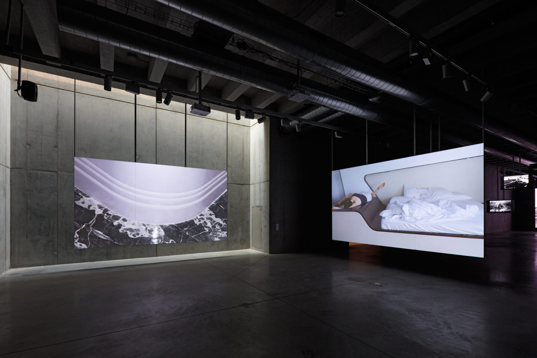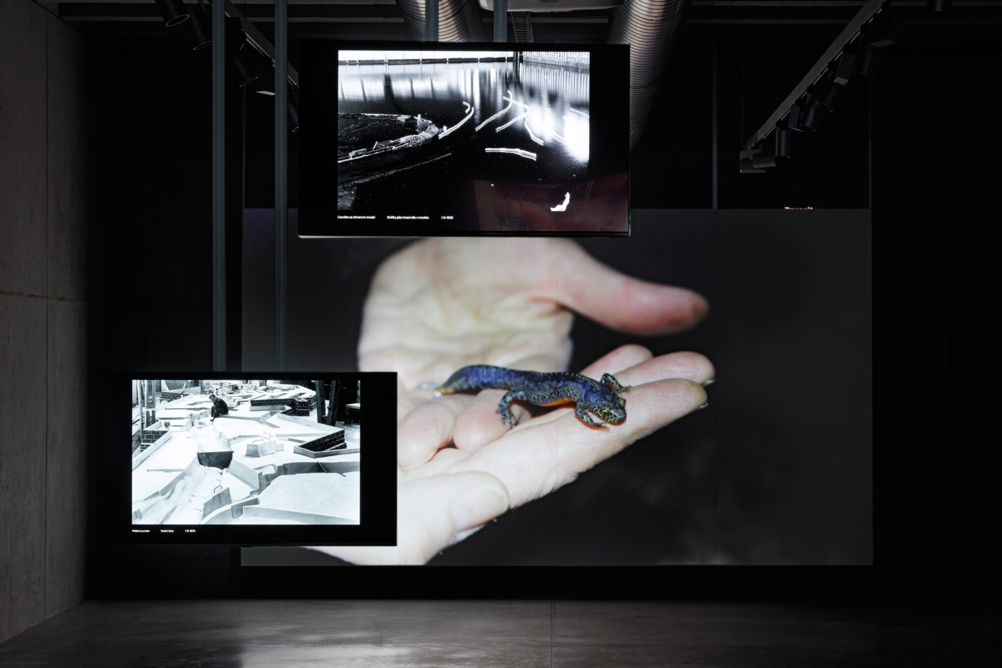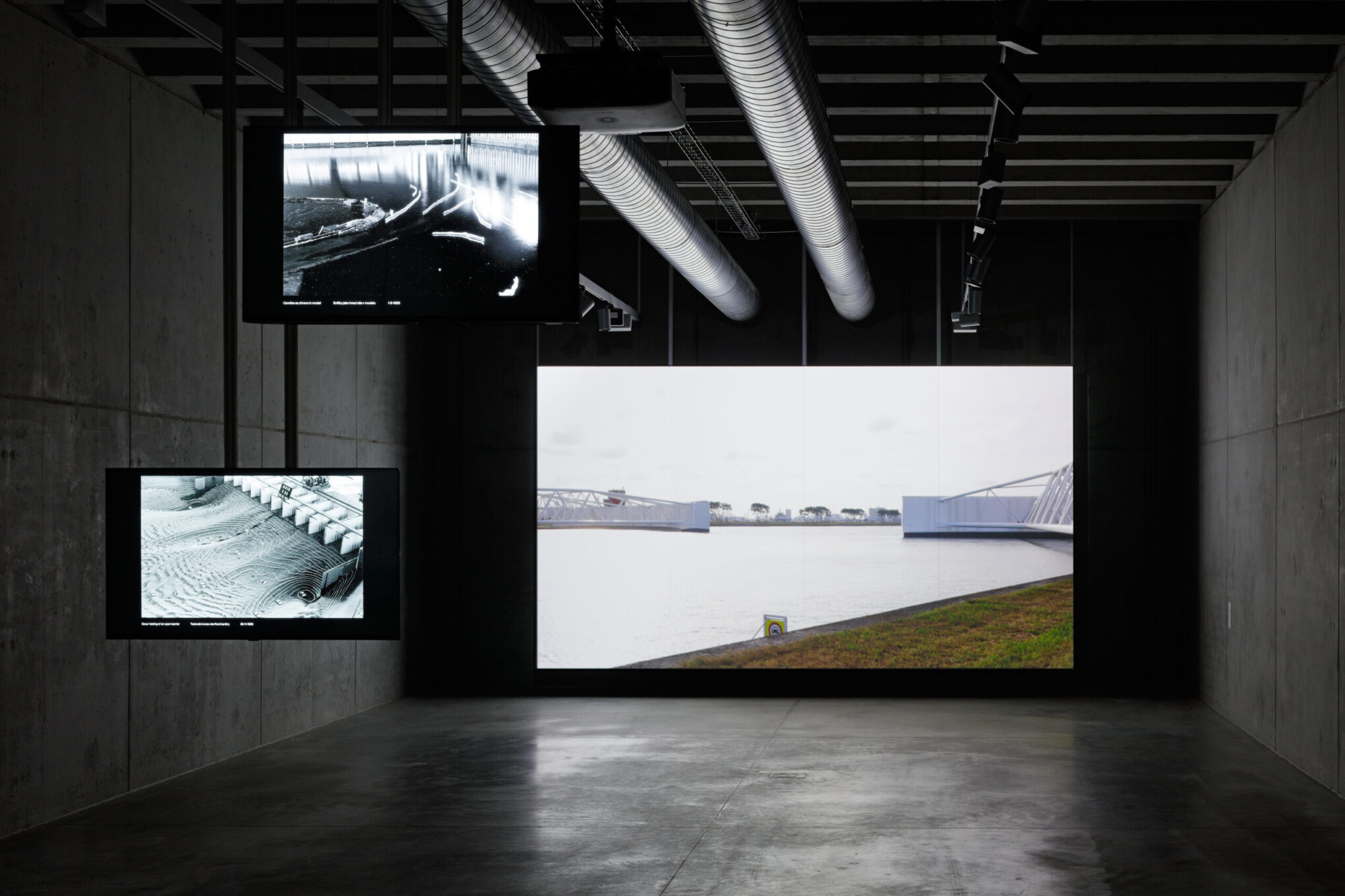 Oba videoprojekty, zejména druhou výše zmíněnou videoprojekci, doplňuje sled fotografií na zavěšených obrazovkách s názvem Ústí vodní cesty (Mouth of the Waterway). Jde opět o záběry z reálu, ve výsledku připomínající grafické rastry nebo měsíční krajinu.