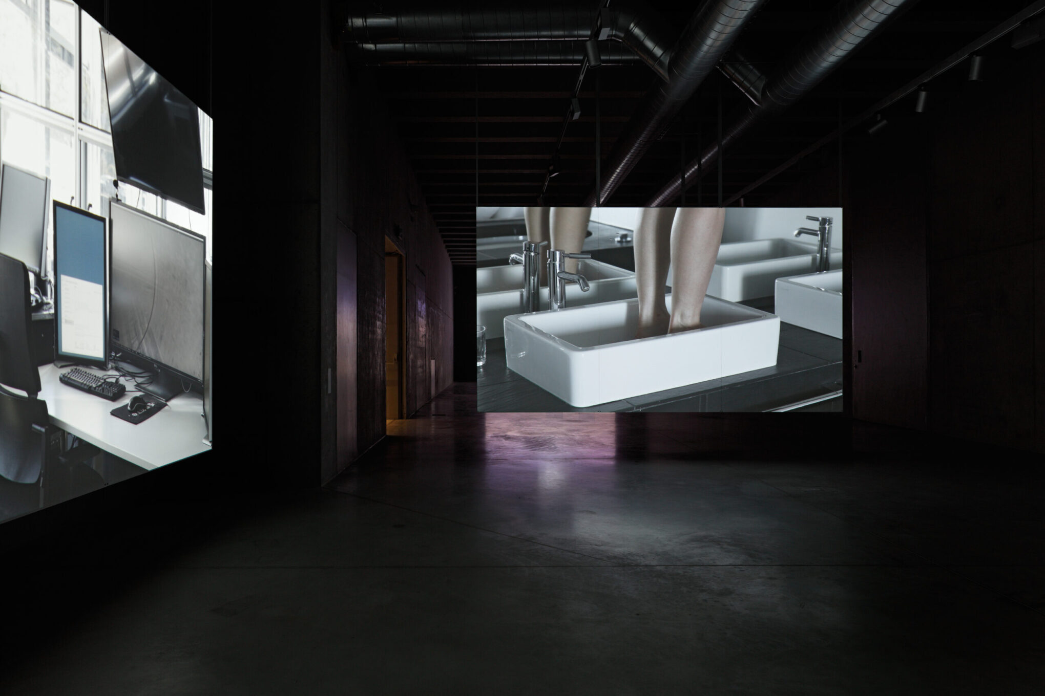 Druhý videoprojekt s názvem Koupelnové studie (Bathroom Studies) kombinuje dvě plátna blízko sebe vedle, na kterých můžeme souběžně sledovat videa ze dvou zcela odlišných prostředí. Video vpravo, popisující probuzení a pohyb těla z lože do vany, je záměrně stylizované, performativní, odosobněné, umocněné sterilním prostředím moderní koupelny. Video vlevo nás vede přes kanálový poklop do útrob kanalizační sítě, jakéhosi města dole. Autorce navíc nešlo jen o pohled pod zem, ale o přiblížení současné techniky, která dnes už běžně zaměstnává roboty s přenosnou kamerou pro obtížnější práce ve stísněných prostorách. Paralelně se odehrávají dva příběhy, v nichž každý má svého „hybatele“, ať už je to housenkovitě se pohybující lidské tělo nebo čtyřnohý chodící robotek, který šikovně zdolává kdejaký hrbol nebo schod.